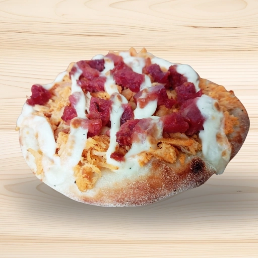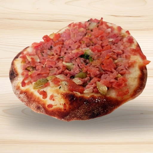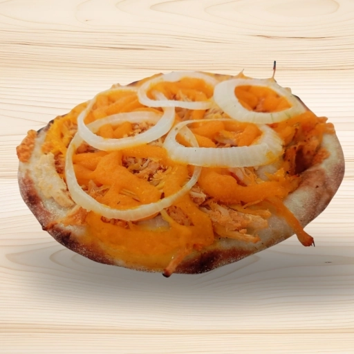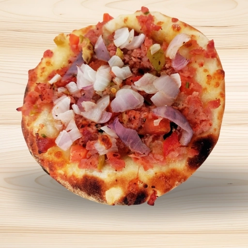 Mussarela,Calabresa Moida da casa,pimenta calabresa e cebola roxa.