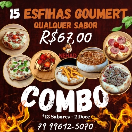 13 esfihas salgadas de qualquer sabor + 2 esfihas doces.